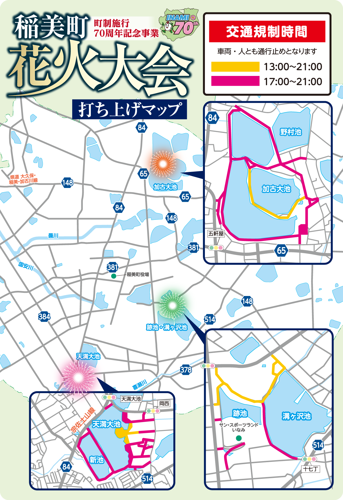 打上場所周辺にはお越しにならないでください。 - 路上駐車は絶対におやめください。
